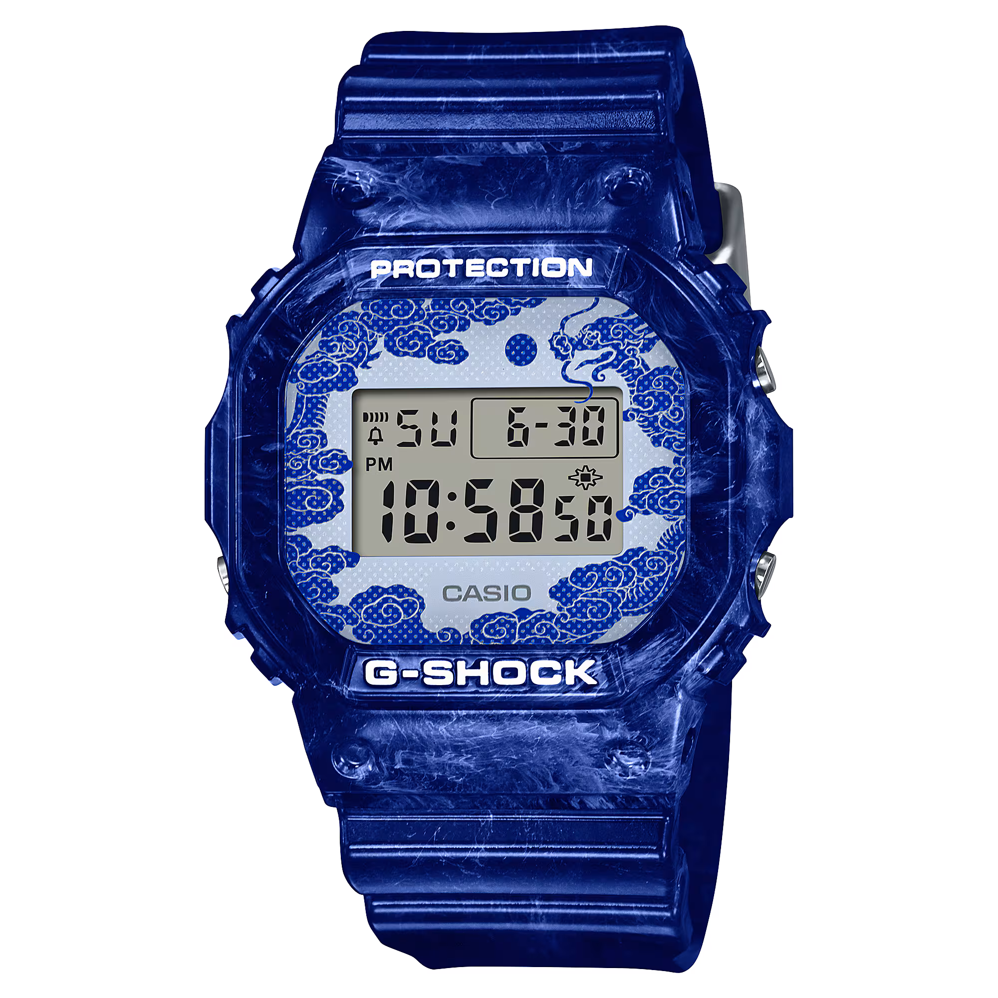 With the delicate beauty of blue and white Chinese porcelain steeled by absolute G-SHOCK toughness. The dial and band feature blue and white motifs celebrating familiar ceramic patterns, while the engraving on the case back evokes the Chinese dragon in motion.