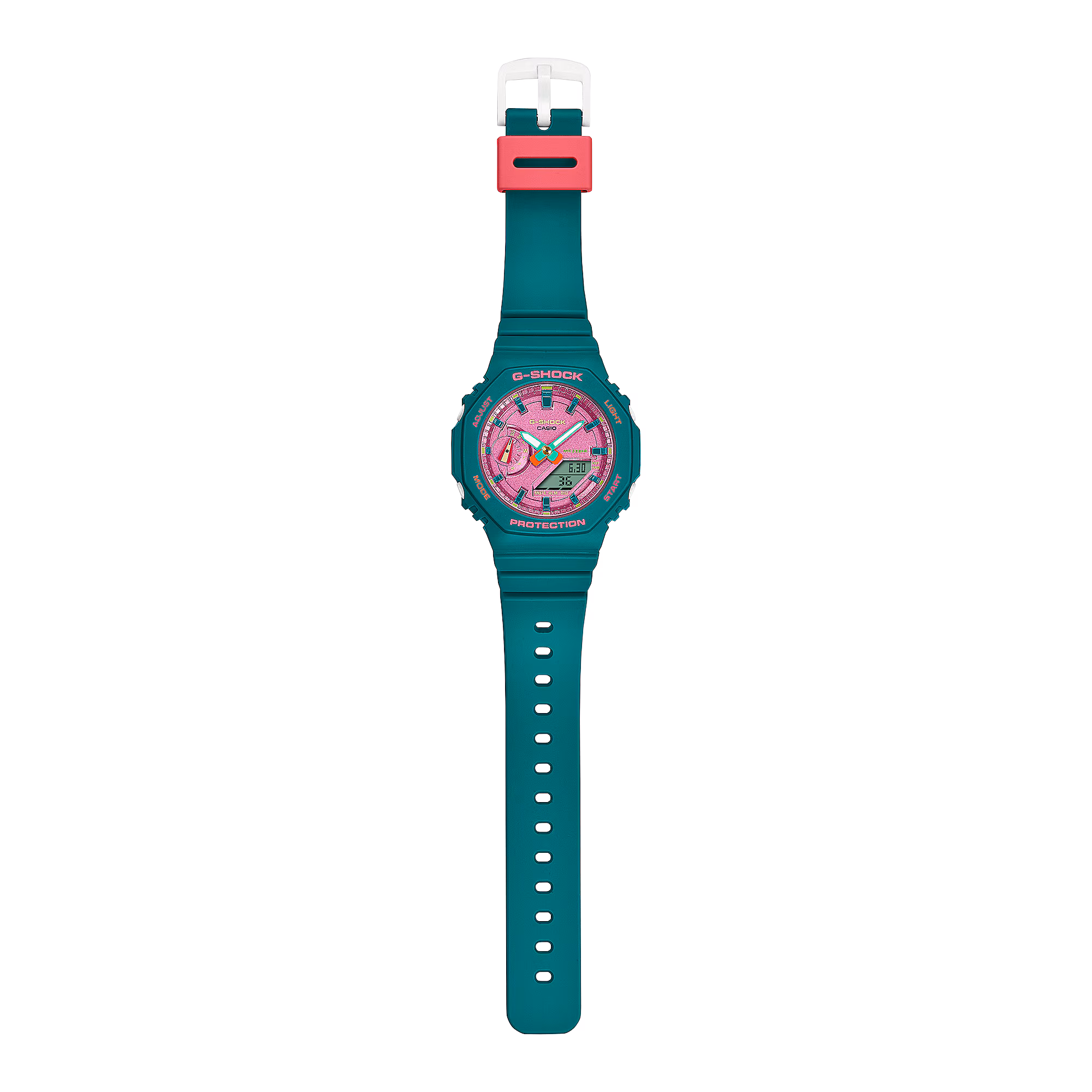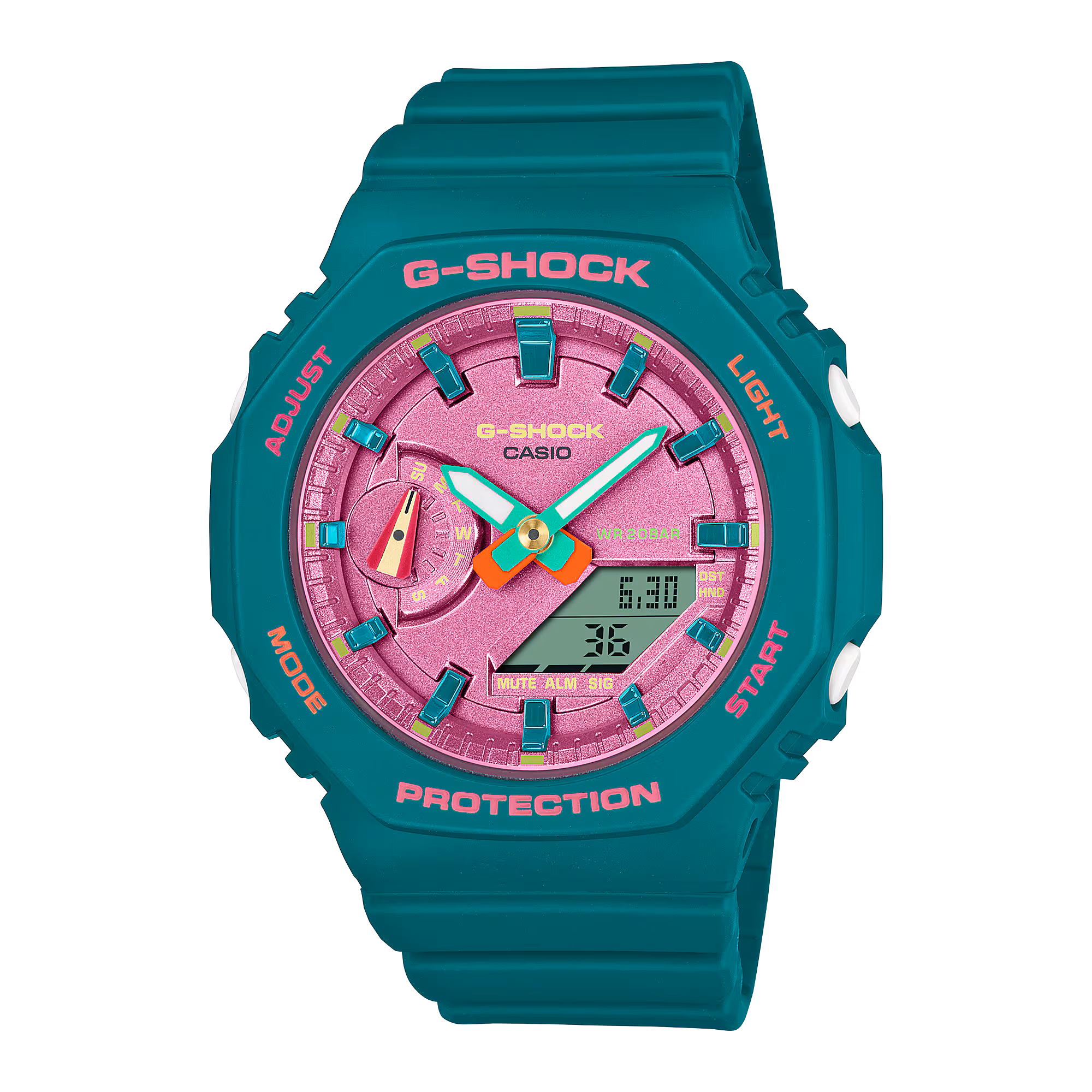 Brighten up your summer days with some vibrant G-SHOCK color. The GMAS2100 features a flat dial and simple bar indexes, each of the components bringing a different color to your fun and festive celebration of the sunniest time of year.