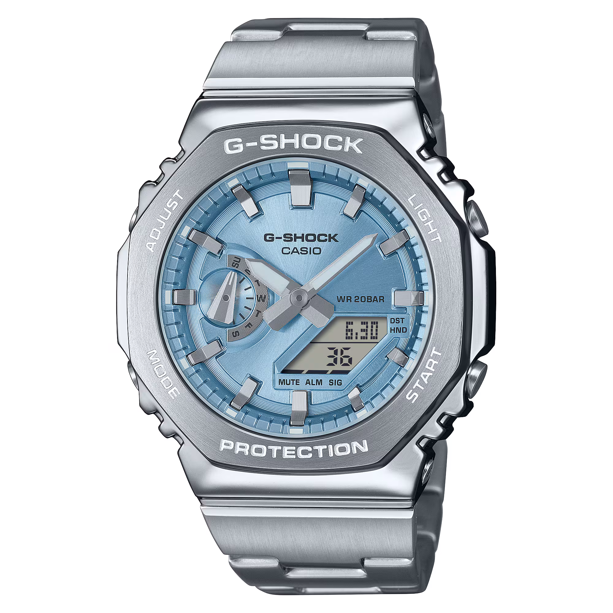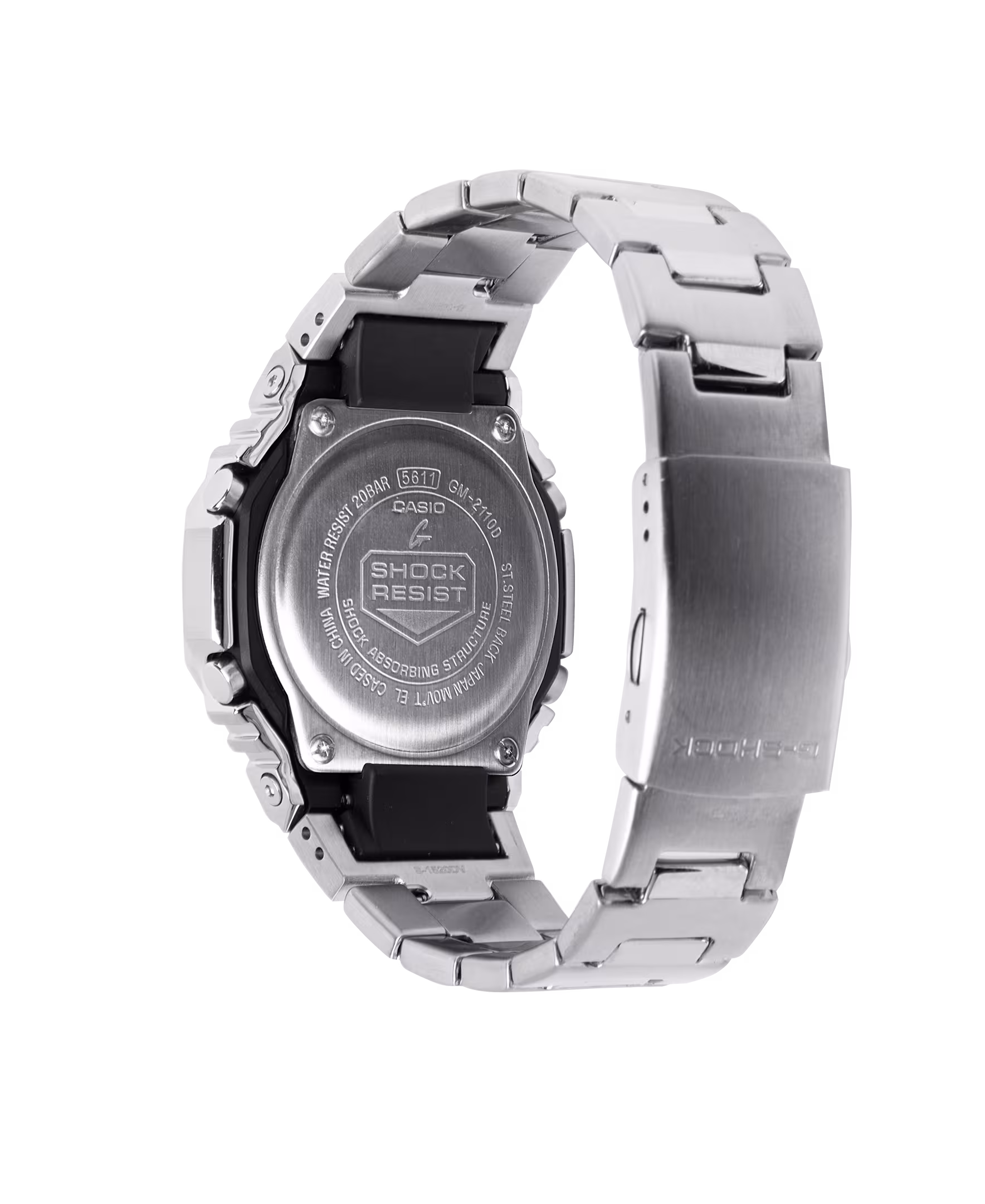 Captivating the watch world in 2019 with its slim case and octagonal bezel, the Casio G-SHOCK GA2100 series redefined the analog-digital watch in style and performance. Always innovating, Casio has released the GM2110D series with a stainless-steel metal bezel and band, casting the original 2100 series in a whole new look while keeping the slim case and design. Having first forged the 2100 into a G-SHOCK 2100 metal watch with a stainless-steel bezel and resin band in the popular GM2100 series, the GM2110D-2A metal G-SHOCK watch sports luxury while remaining practical, and the sophisticated ease of the one-touch, three-fold metal clasp represents that focus.