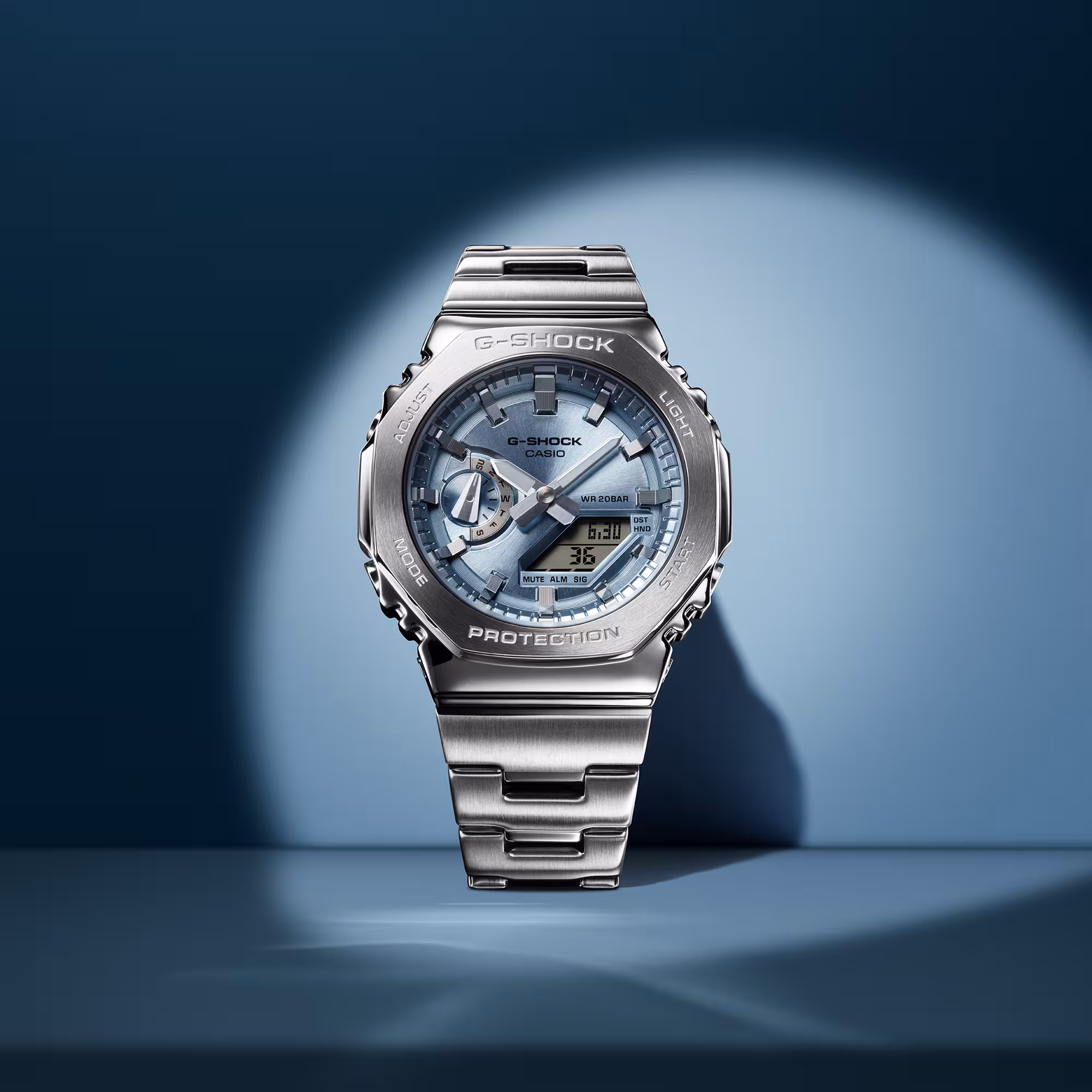 Cast in five different colors, the GM2110D series flourishes two blue-dial watches, the light blue GM2110D-2A and the dark blue GM2110D-2B. Evoking the natural blues of both sea and sky, these blue-dial watches are graced with stainless steel and the legendary performance of G-SHOCK.