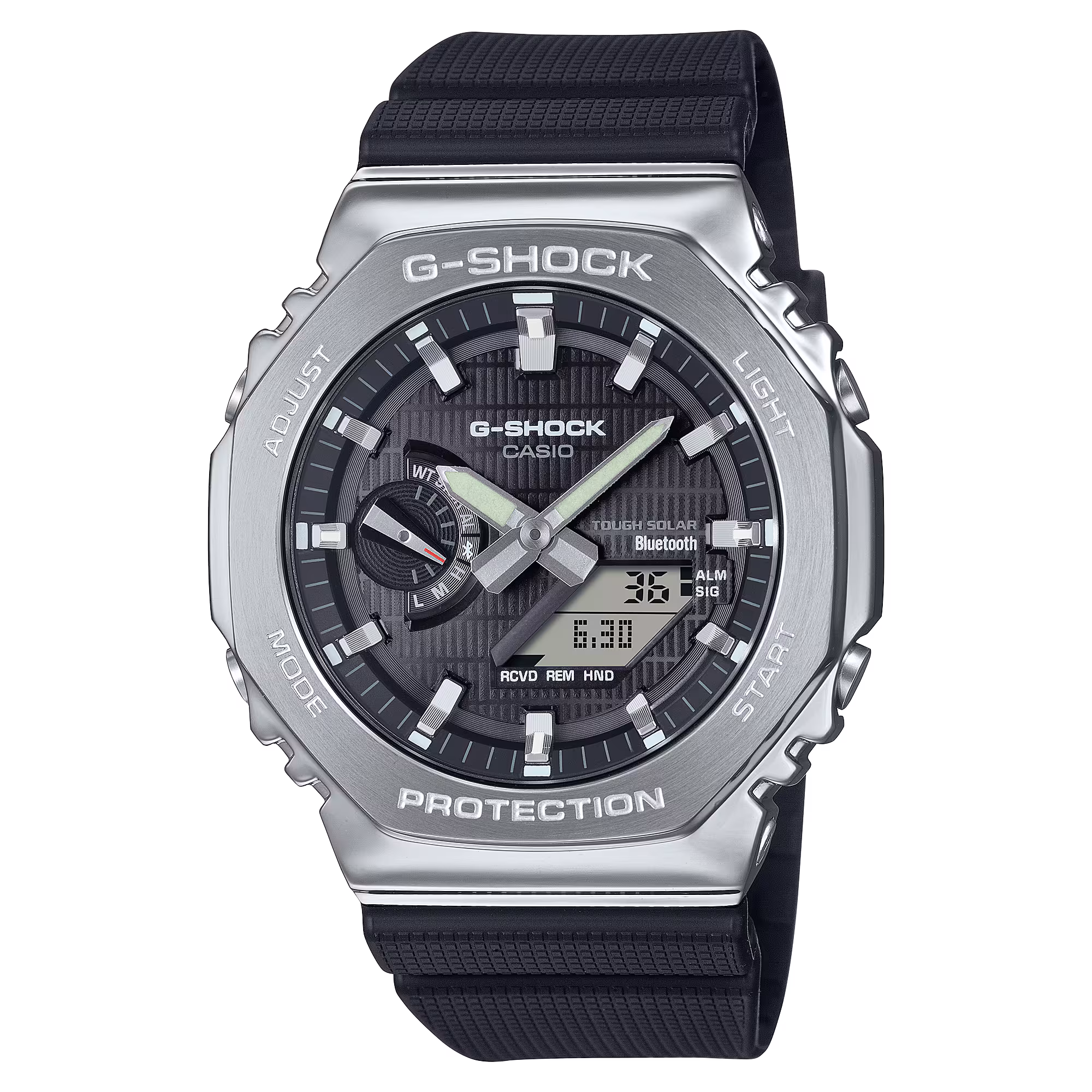Taking the industry by storm in 2019, the GA2100 series pushed the bounds of design by offering a thin watch with an octagonal bezel and legendary G-SHOCK protection. G-SHOCK then revolutionized the series by adding a stainless-steel bezel, forging the GM2100 series. Always innovating, G-SHOCK then added Bluetooth® connectivity and Tough Solar charging to craft a steel watch beyond compare: the GBM2100 series stainless-steel watch. G-SHOCK G-STEEL combines sophisticated style with peace of mind, crafting steel watches with durable shock resistance and 200-meter water resistance (wr 20 bar). Going the extra mile, G-SHOCK manufactured the watchcase and band from bio-based resin, a material thought to reduce environmental impact. Conscientious at every level, that’s G-SHOCK G-STEEL.