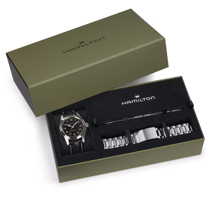 This special bundle set gives you more choices to wear the iconic Khaki Field Murph 42mm, complete with a sophisticated leather strap and a sleek stainless steel bracelet in one special package. Relying on the utmost craftsmanship and know-how, Hamilton is committed to achieving excellence with a focus on durability and attention to detail. Our durable leather straps will add a timeless and enduring appeal to your timepiece, while metal bracelets, engineered for comfort and versatility, give your timepiece a refined and elegant edge.