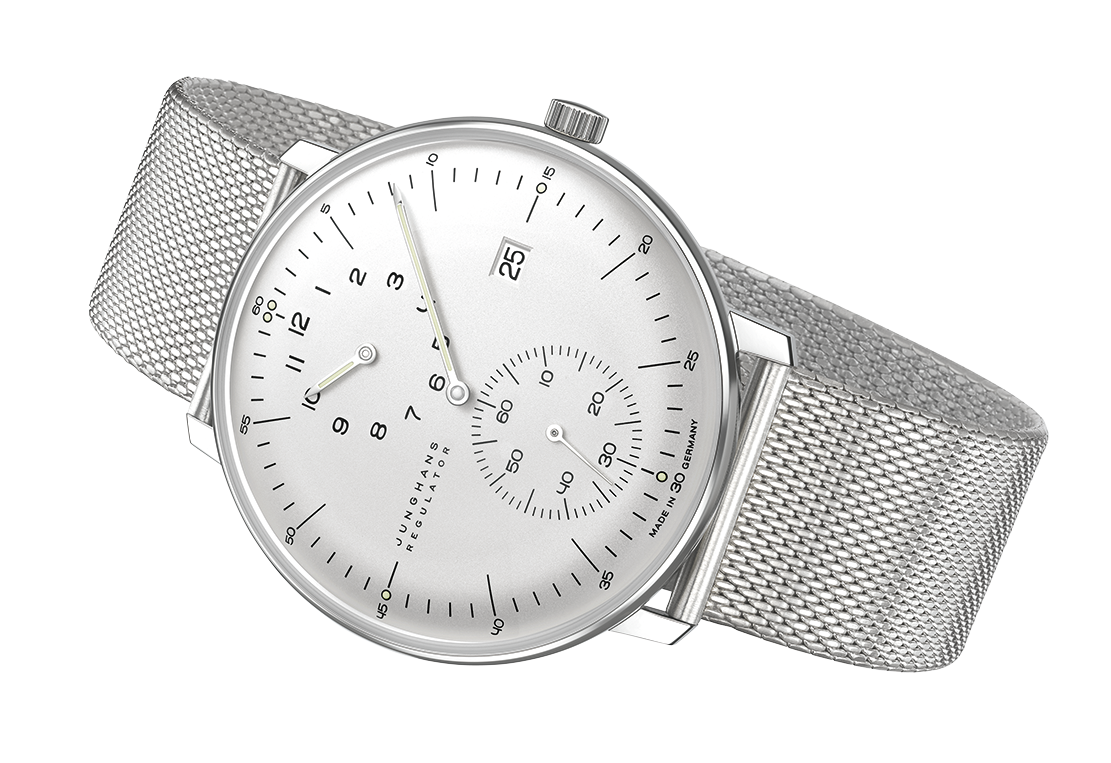 The max bill Regulator has the typical face of the model series with a discreet fine silver-plated dial and a unique typography designed especially for these models. The additional designation indicates that this is a special dial layout with a central minute hand and decentralised hour and second hands.