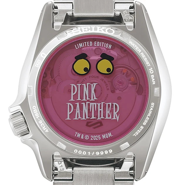 The case back features one of the most memorable scenes from the animation, with the Pink Panther hiding against a pink wall. Around the edge, the words “Limited Edition” and the individual serial number are engraved, highlighting the watch’s exclusivity.