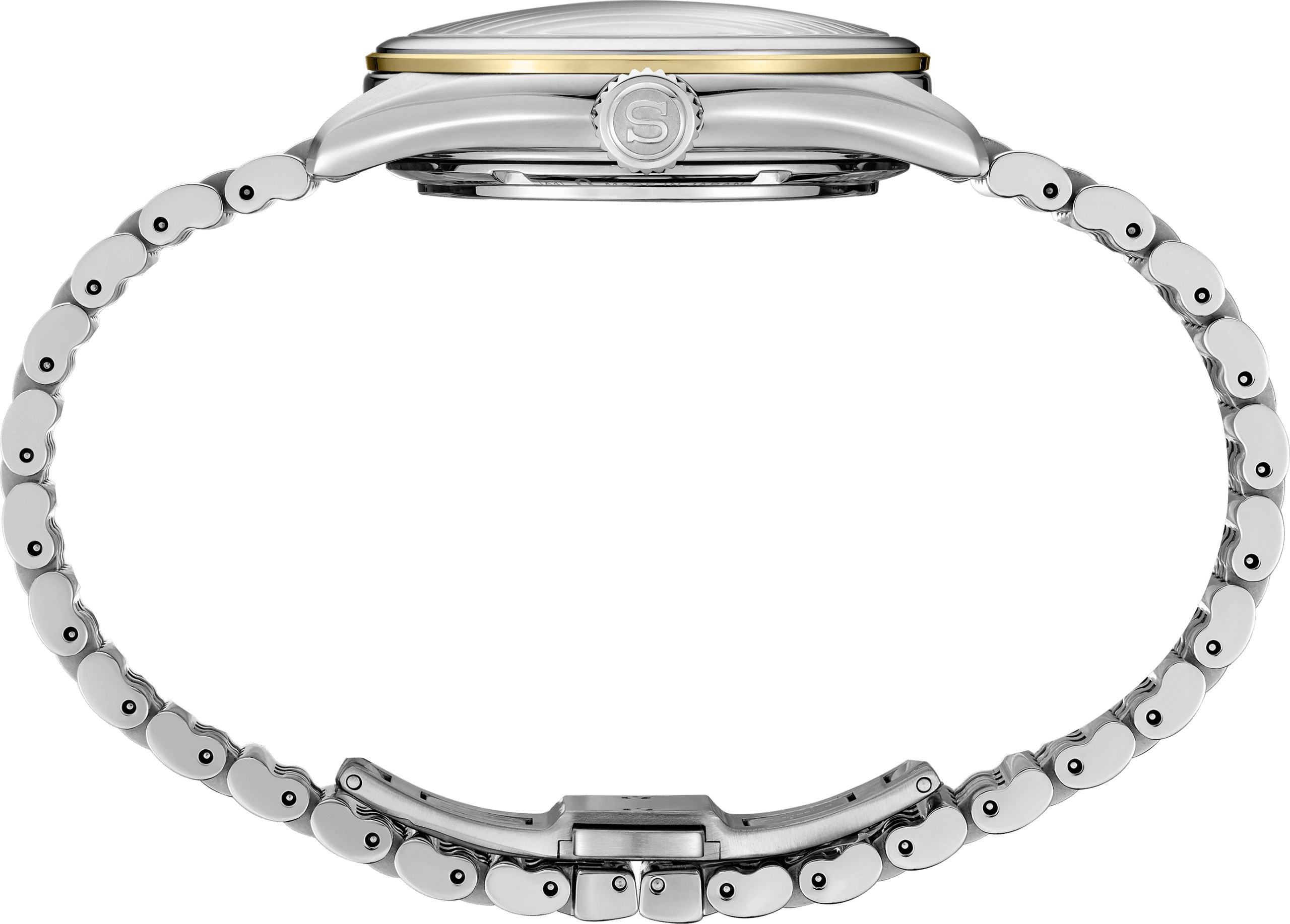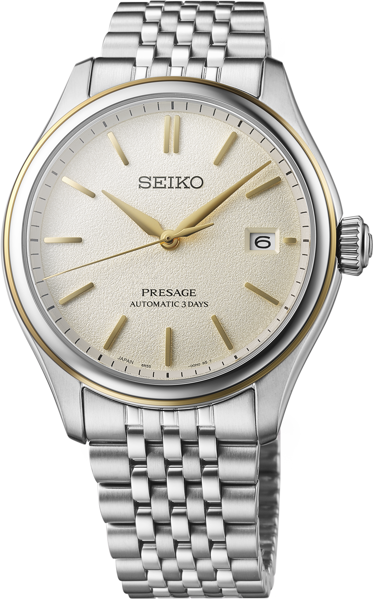 Offering the finest in Japanese mechanical watchmaking, the Presage Collection blends precision technology with superior craftsmanship and design. The Presage Classic Series draws from the colors, materials and textures of traditional crafts, each timepiece gracefully expressing Japan’s timeless beauty. In “shiro-iro,” the color of unbleached natural silk, the curved dial of this streamlined design has a richly textured pattern that evokes the lustrous fabric, while capturing and reflecting ambient light to create a heightened sense of depth and beauty. With gold accents to symbolize nobility and sacredness, in a color often used for celebrations, the elegant and classic style of the design is further enhanced. Visible through the screwdown, see-through caseback, Seiko’s 6R caliber, 24-jewel automatic movement beats at a frequency of 21,600 vibrations per hour, with an exceptional power reserve of 72 hours, manual winding capability and a date calendar complication. Crafted of stainless steel, the case is constructed with smooth curved surfaces and includes a dual curved sapphire crystal, echoing the contours of the dome-shaped dial. The retro-inspired multi-row bracelet with curved top surfaces helps achieve a superbly sleek and comfortable fit and is equipped with a deployment clasp with push button release. 10 bar, 100M Water Resistant