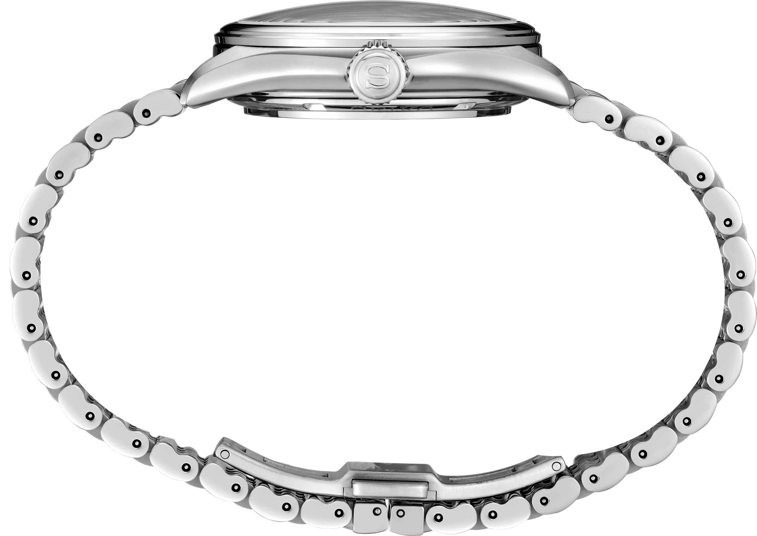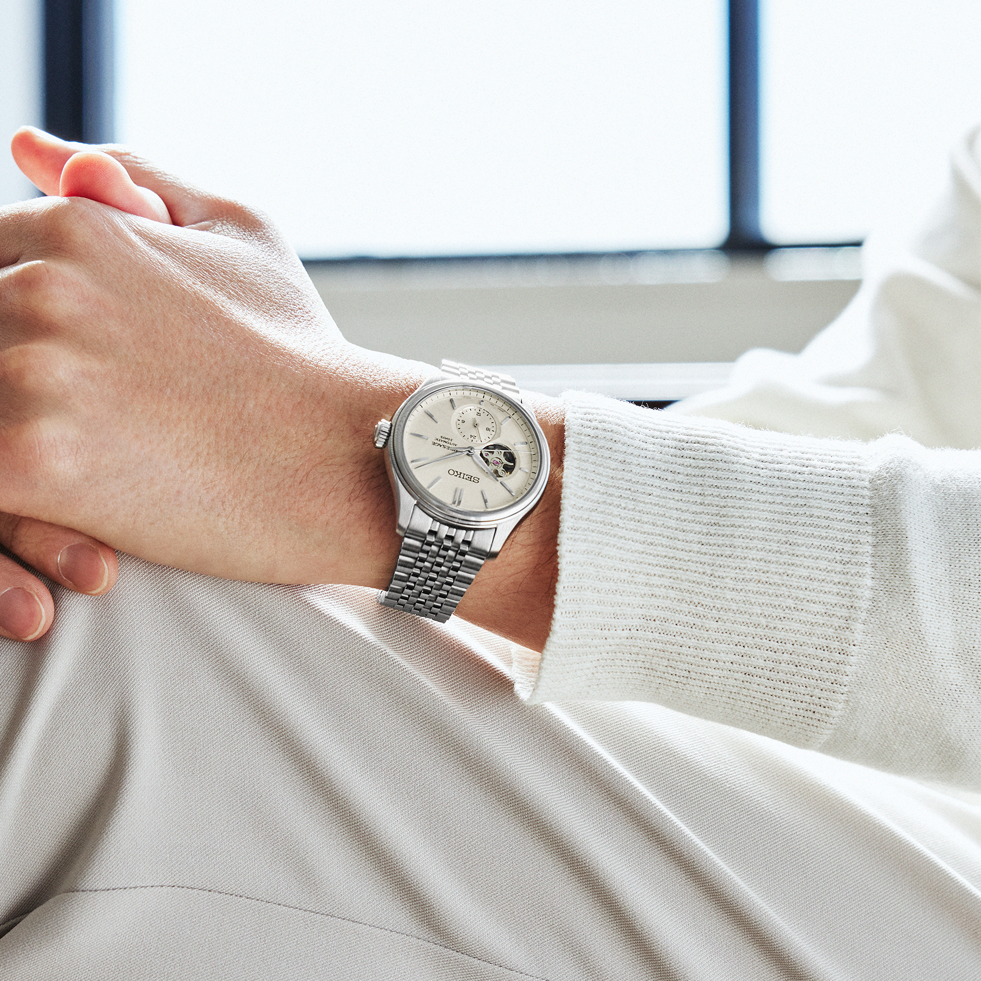 Offering the finest in Japanese mechanical watchmaking, the Presage Collection blends precision technology with superior craftsmanship and design. The Presage Classic Series draws from the colors, materials and textures of traditional crafts, each timepiece gracefully expressing Japan’s timeless beauty. In “shiro-iro,” the color of unbleached natural silk fabric, the curved dial of this streamlined design has a richly textured pattern that evokes raw silk yarn, while capturing and reflecting ambient light to create a heightened sense of depth and beauty. Visible through both the open aperture dial and see-through caseback Seiko’s 6R caliber, 24-jewel automatic movement beats at a frequency of 21,600 vibrations per hour, with an exceptional power reserve of 72 hours, manual winding capability and a 24-hour complication. Crafted of stainless steel, the case is constructed with smooth curved surfaces and includes a dual curved sapphire crystal, echoing the contours of the dome-shaped dial. The retro-inspired multi-row bracelet with curved top surfaces helps achieve a superbly sleek and comfortable fit and is equipped with a deployment clasp with push button release. 10 bar, 100M Water Resistant