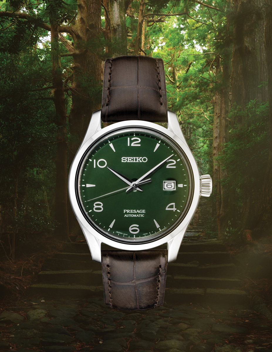 Inspired by the rich cedar green tones of a Japanese evergreen forest, this elegant limited edition timepiece expands the possibilities of fine enamel craftsmanship with a unique dial color individually created by master artisan Mitsuru Yokosawa in an exacting, multi-step process. Completing the image of a graceful tree is the deep brown of the crocodile strap. With dual-curved sapphire crystal, stainless steel case, screwdown see-through caseback and 24-jewel automatic movement, this exquisite watch is available only in a single, controlled run of 2,000, each with the serial number engraved on the caseback.