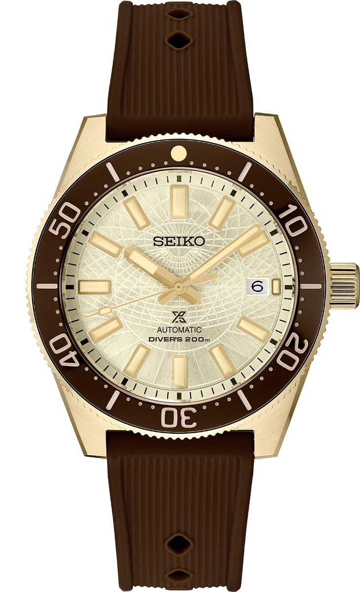 Designed for those who treat life as the ultimate adventure, the Seiko Prospex line meets every challenge with technological excellence and style. Part of a rich legacy of innovation in high-intensity timekeeping, Prospex continues to celebrate a long history of sports watch excellence with re-creations and re-interpretations of landmark achievements. Updated with today’s technology and materials, and a sleeker and thinner profile, this extraordinary Limited Edition, available in a controlled production run of 300 with the serial number engraved on each caseback, reimagines Seiko’s 1965 diver’s watch, the first made in Japan, with a water resistance, legibility and durability that made it standard equipment on the Japanese Antarctic Research Expedition (JARE), and propelled Seiko into the forefront of dive watch design. Paying tribute to underwater archaeology, this re-interpretation features a light champagne sunray dial with a design inspired by ancient astrolabes, used to find latitude and time based on the position of the stars and the sun. The caliber 8L35 26-jewel automatic movement, hand-assembled at Seiko’s Shizukuishi watch studio with the increased torque necessary for smooth operation of the enlarged diver’s watch hands, beats at a frequency of 28,800 vibrations per hour, with a power reserve of approximately 50 hours, and provides manual winding capability. Following ISO standards for scuba diving to depths of up to 200 meters, this superbly functional watch, in stainless steel with gold finish, also includes a date calendar, LumiBrite markers and hands for enhanced legibility, dual curved sapphire crystal with anti-reflective coating on the inner surface, screwdown crown and caseback, brown uni-directional rotating elapsed timing bezel and brown silicone strap. As part of Seiko’s “Save the Ocean” campaign, a portion of the proceeds from sales of this exceptional Limited Edition will be contributed to marine conservation. Packaged in a Limited Edition collectors’ box. 200m Water Resistant