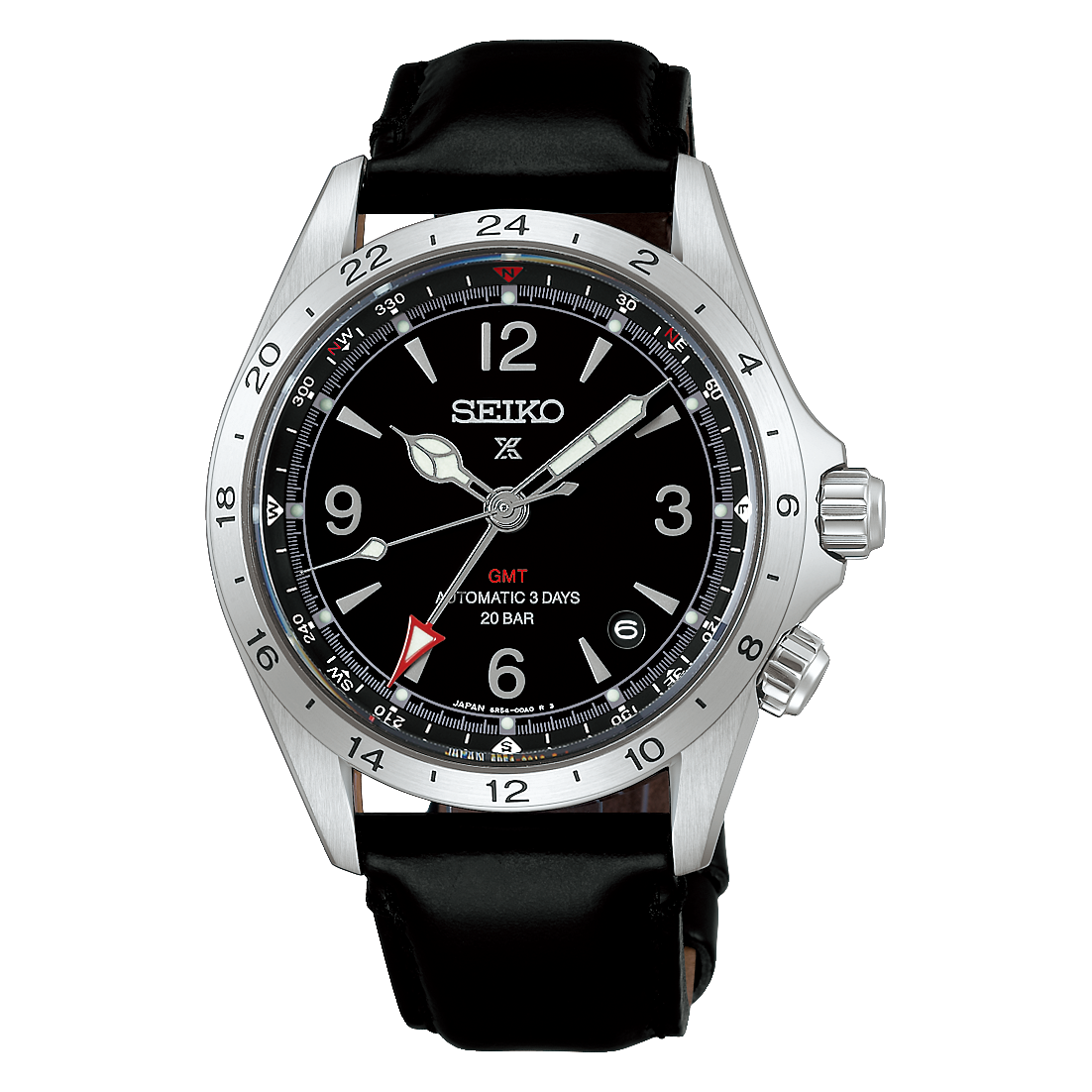 Designed for those who treat life as the ultimate adventure, the Seiko Prospex line meets every challenge with technological excellence and style. Part of a rich legacy of innovation in high-intensity timekeeping, Prospex continues to celebrate a long history of sports watch excellence with re-creations and re-interpretations of landmark achievements. Inspired by Seiko’s first sports watch, the 1959 Alpinist, this rugged, yet stylish, watch features the iconic wedge-shaped markers, bold numerals and stylized hands of the original, along with 24-hour GMT timing. An upgraded curved sapphire crystal with anti-reflective inner coating adds reliable visibility, while the inner rotating compass bezel makes it ideal for hiking and outdoor activities. Framed by a 24-hour GMT bezel, the classic black dial includes a date calendar, LumiBrite hands and markers, and a red-tipped GMT hand. The 24-jewel automatic movement, visible through the see-through screwdown caseback, beats at a frequency of 21,600 vibrations per hour and offers an exceptional power reserve of 72 hours, as well as manual winding capability. Crafted of stainless steel with durable super-hard coating and a secure screwdown crown, this superb timepiece also features a black leather strap with tri-fold push button release clasp. 20 bar, 200M Water Resistant