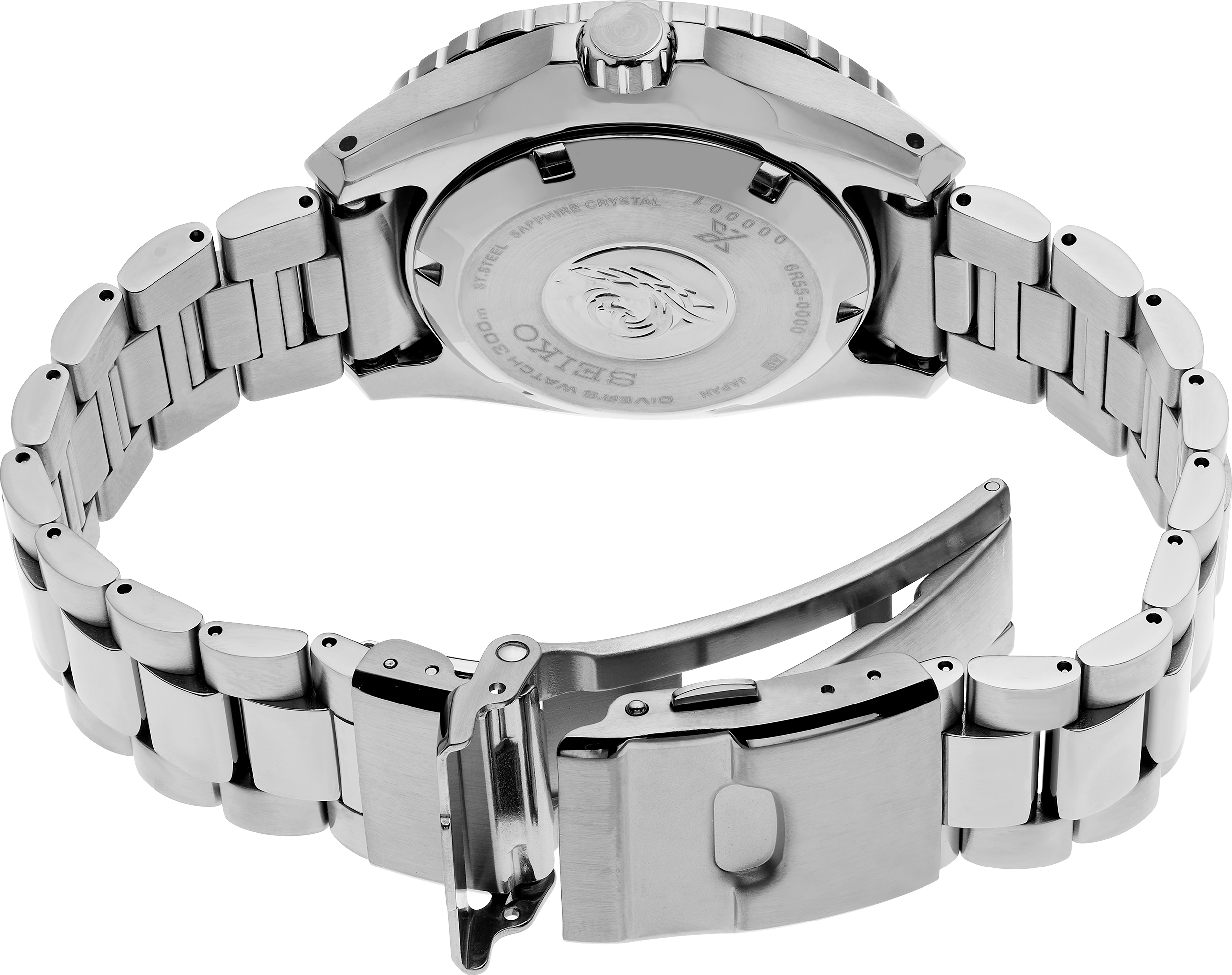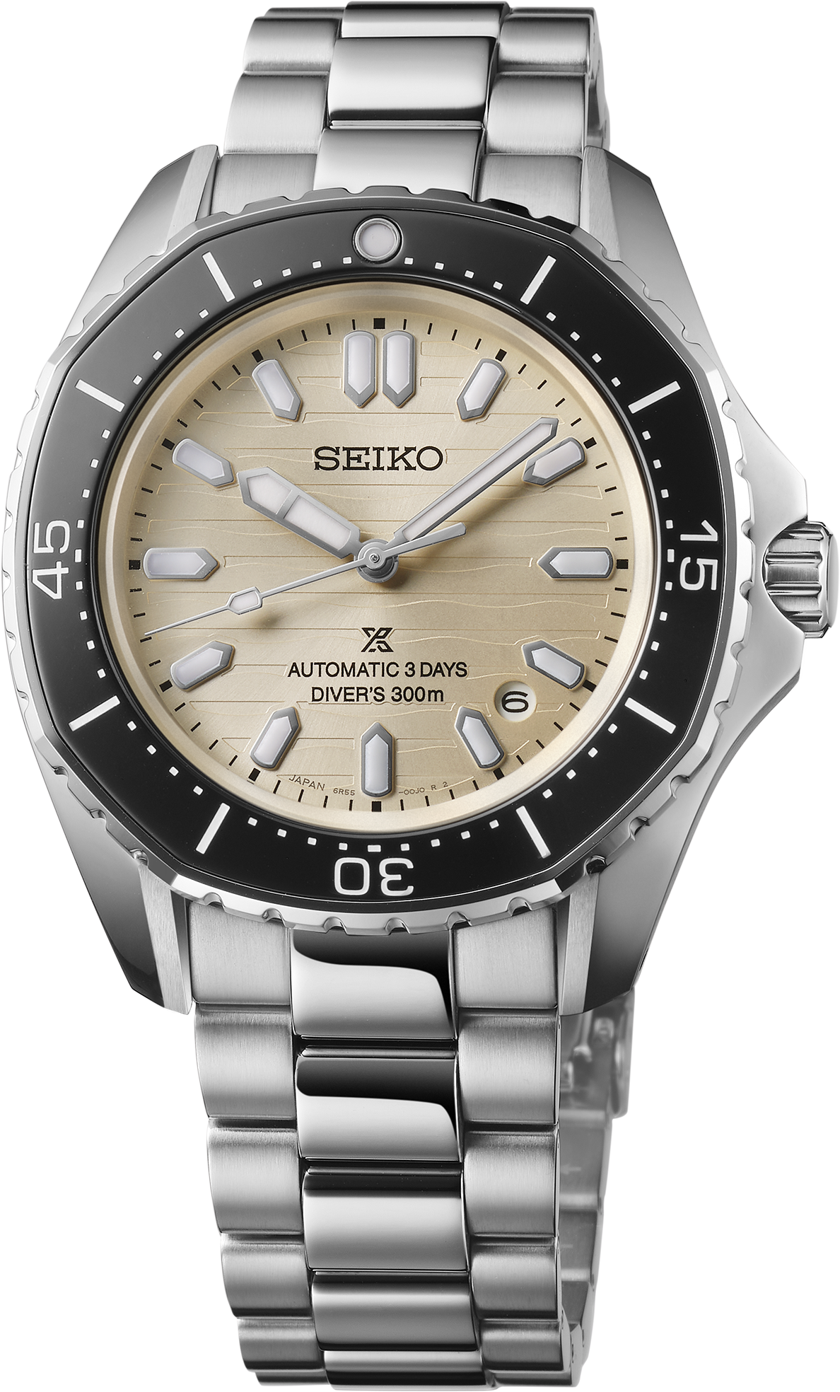 Designed for those who treat life as the ultimate adventure, the Seiko Prospex collection meets every challenge with technological excellence and style, continuing the rich legacy of innovation in high-intensity timekeeping. Framed by a black polygonal uni-directional rotating elapsed timing bezel, suited for formal occasions while keeping an active and sporty impression, the ivory pressed pattern dial, inspired by a calm coastline, offers a date calendar between 4 and 5 o’clock allowing for LumiBrite coating on the hands and all 12 markers, improving symmetry and legibility. With an upgraded power reserve of approximately 72 hours, 3 full days, the 24-jewel automatic movement beats at a frequency of 21,600 vibrations per hour and features manual winding capability. Crafted of stainless steel with super-hard coating, this superbly functional diver’s watch includes a sapphire crystal with anti-reflective coating on the inner surface, as well as a screwdown crown and caseback. The bracelet is designed with mirror polish center links to match the sophisticated case design, which follows ISO standards for scuba diving to depths of 300 meters while maintaining a slim profile. 300m Water Resistant