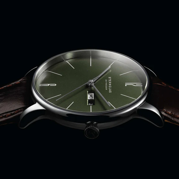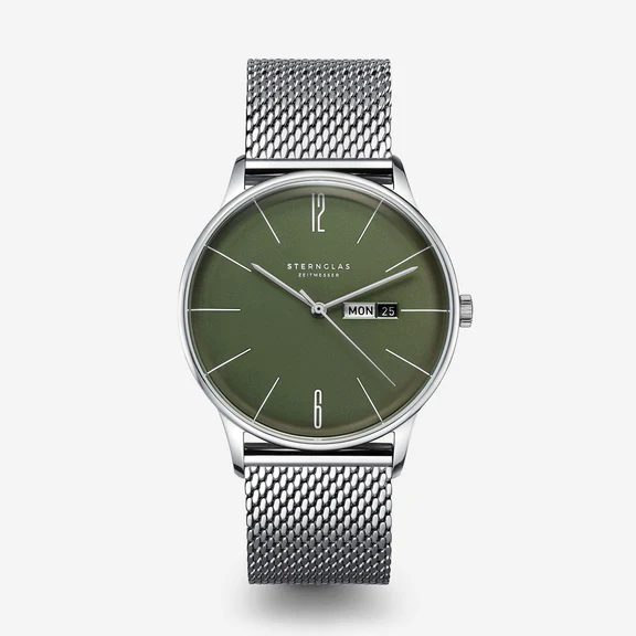 The result is the Berlin model with weekday and date display. The 38 mm silver case and alligator-embossed strap underscore the vintage style of the timepiece. With a case height of 8 mm, the Berlin is comfortable on the wrist and combines timeless style with minimalist design.