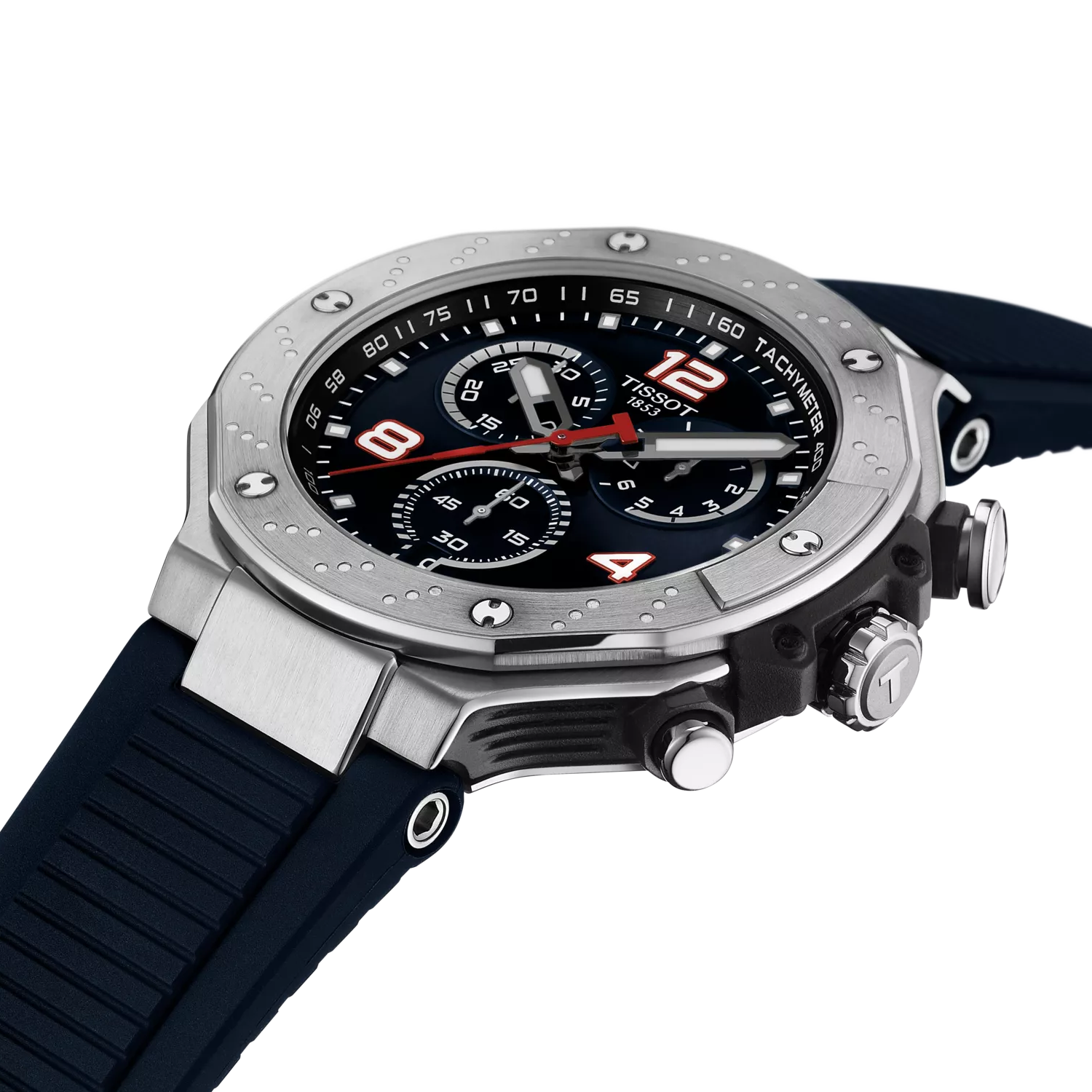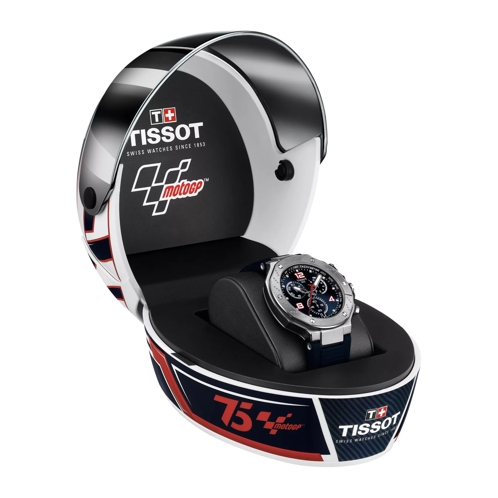 The thrills of MotoGP™ and the passion of Tissot cannot be separated. Celebrating a quarter-century as the championship’s official timekeeper and honouring the 75-year legacy of MotoGP™, Tissot introduces this distinct T-Race MotoGP™ timepiece to honour the well-oiled partnership and those important milestones. One eye on the clock, the other on the road. Adorned in a distinct palette of blue and red, this watch features design cues like brake discs, handlebar-inspired pushes, and engine cooling fins. This one is equipped with a quartz movement. Its dial gives the notion of speed, with speedometer-inspired chronographs. It is water resistant and has hour and minute hands coated with Super-LumiNova®, clarity and great readability in all circumstances. This watch comes packaged in a mini helmet, ideal for aficionados who are looking for something that represents their love for their favorite sport.